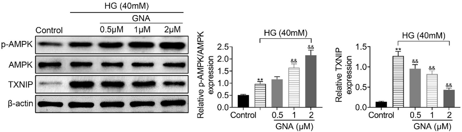 Figure 4. Gambogenic acid suppressed activation of AMPK–TXNIP signaling in high glucose (HG)-induced HK-2 cells. Gambogenic acid reduced the protein expression of TXNIP and promoted the protein expression of p-AMPK in high glucose-treated HK-2 cell line. **vs. control, P < 0.01. &&vs. HG group, P < 0.01.
