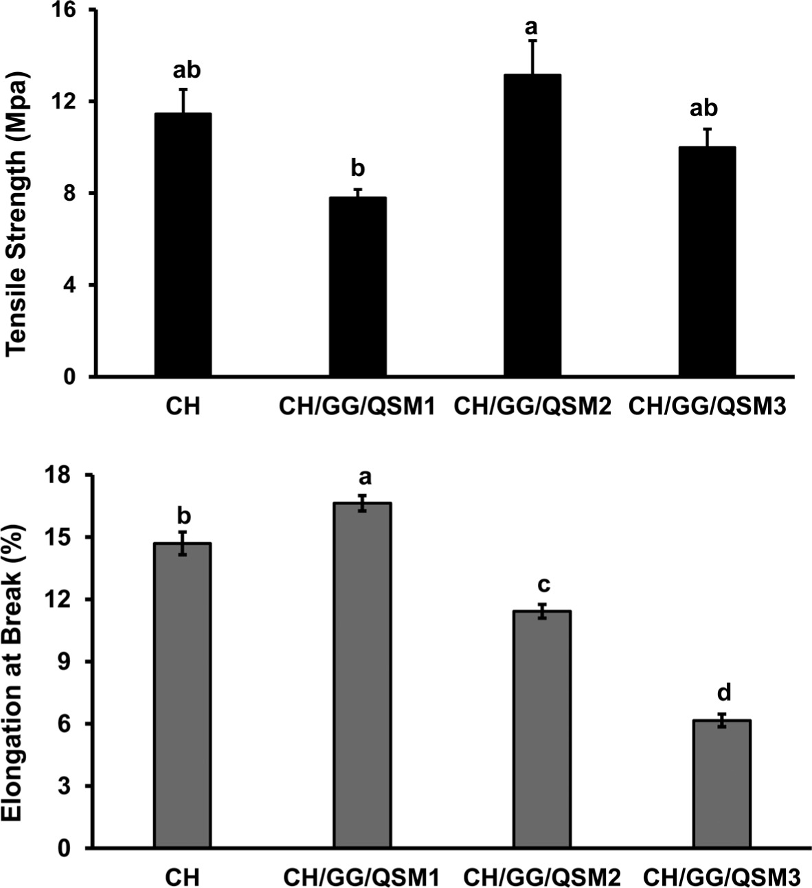 Figure 2. Tensile strength (TS) and elongation at break (EB) of CH, CH/GG/QSM1, CH/GG/QSM2, and CH/GG/QSM3 films (different letters indicate significant differences, P < 0.05).
