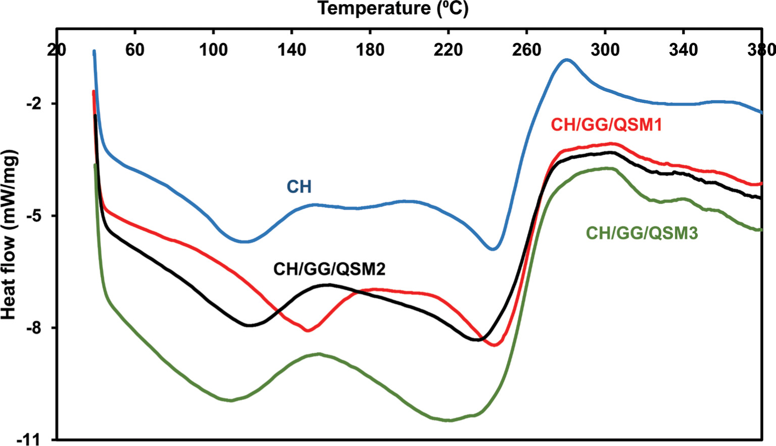 Table 5. Tg, and Ttd values of CH, CH/GG/QSM1, CH/GG/QSM2, and CH/GG/QSM3 films.