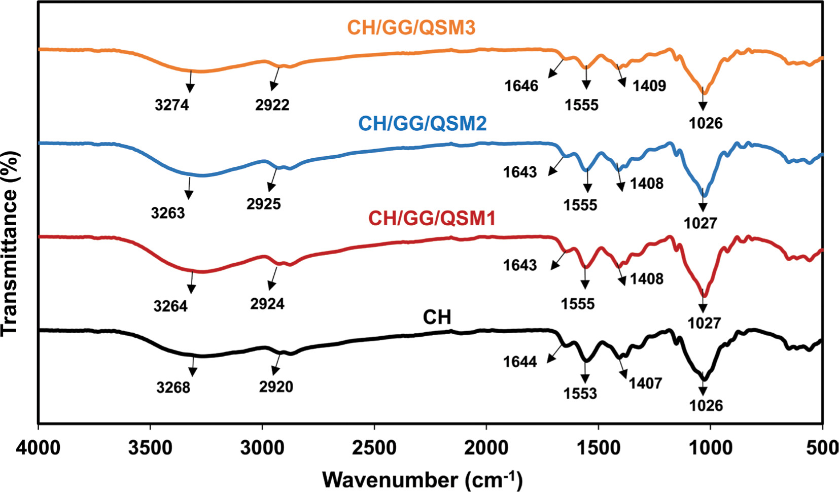 The peak at 3,268 cm-1 in CH spectrum, attributed to hydrogen bonding interactions between amino and hydroxyl groups, shifted to 3,264 cm-1, 3263 cm-1 and 3274 cm-1 in CH/GG/QSM1, CH/GG/QSM2, and CH/GG/QSM3 composite films, respectively, indicating strengthening of hydrogen bonds (Narasagoudr et al., 2023). Similarly, peak at 2,920 cm-1, corresponding to symmetric C–H stretching in CH, appeared at 2,924 cm-1, 2,925 cm-1, and 2,922 cm-1 in respective composite films. These spectral shifts suggest modifications in the chemical environment because of interactions between film components.