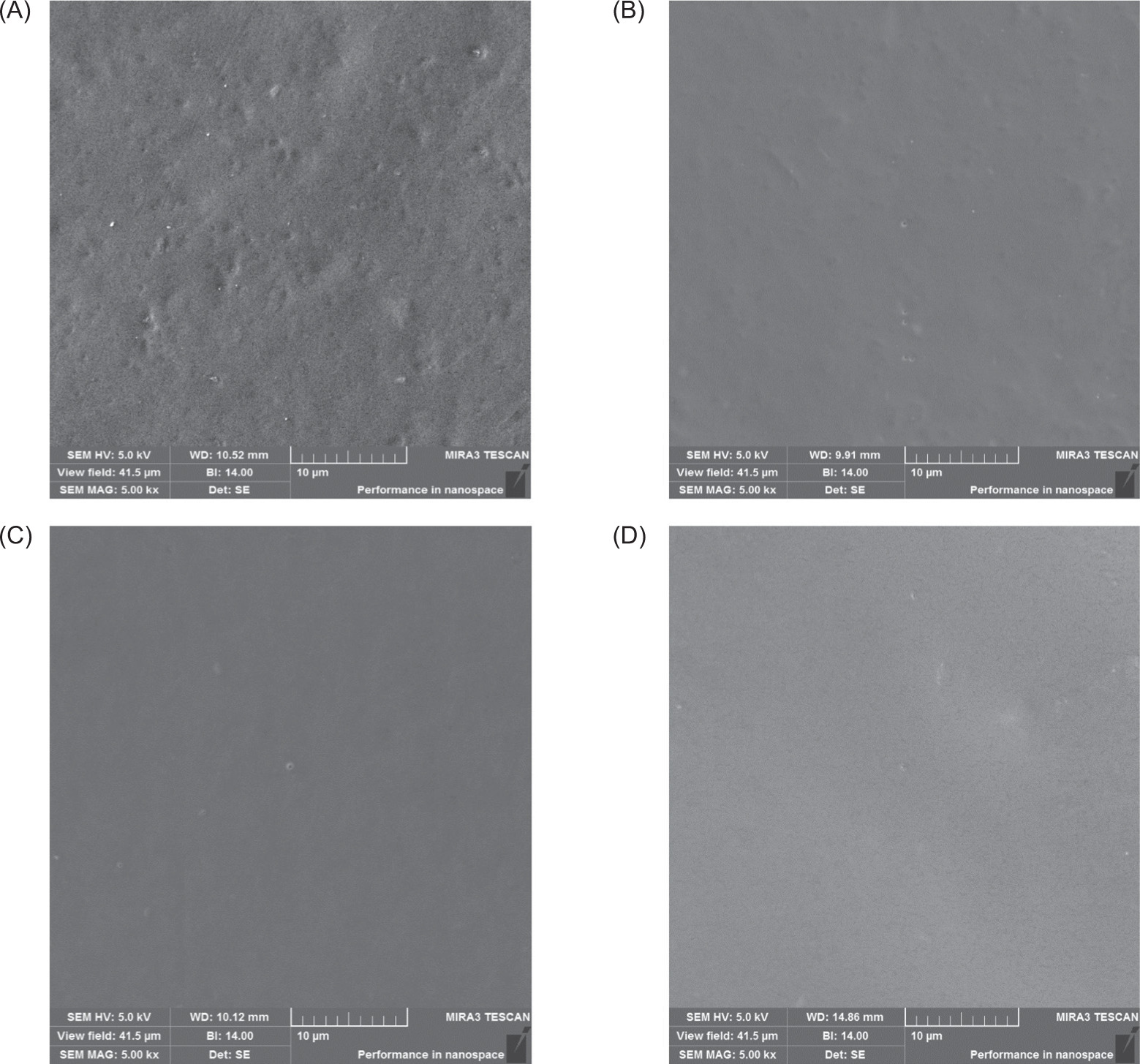 Figure 5. The SEM observation of films: (A) CH, (B) CH/GG/QSM1, (C) CH/GG/QSM2, and (D) CH/GG/QSM3. Magnification: 1,000×; Scale bar: 10 μm.