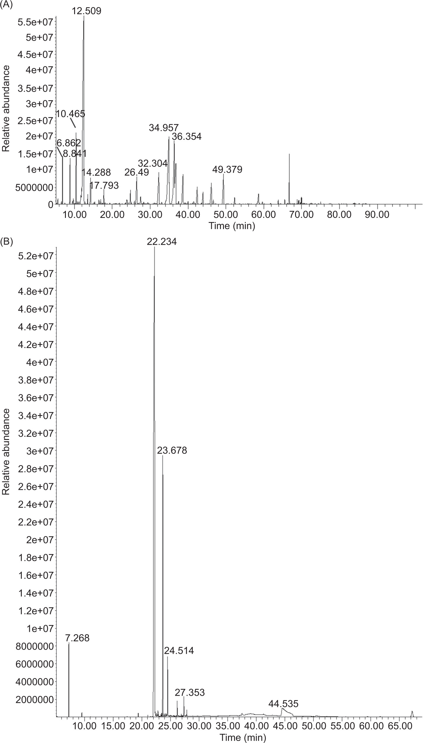Figure 1. The gas chromatography-mass spectrometer analysis of AEO (A) and CEO (B).