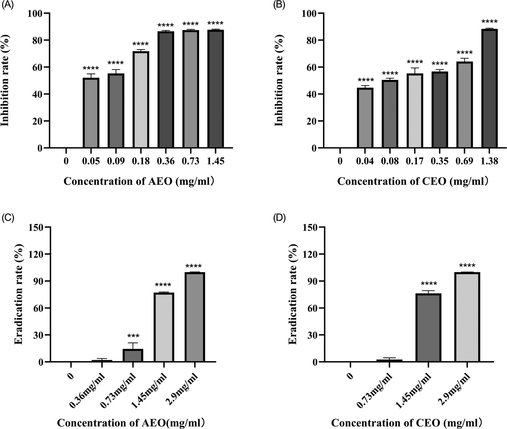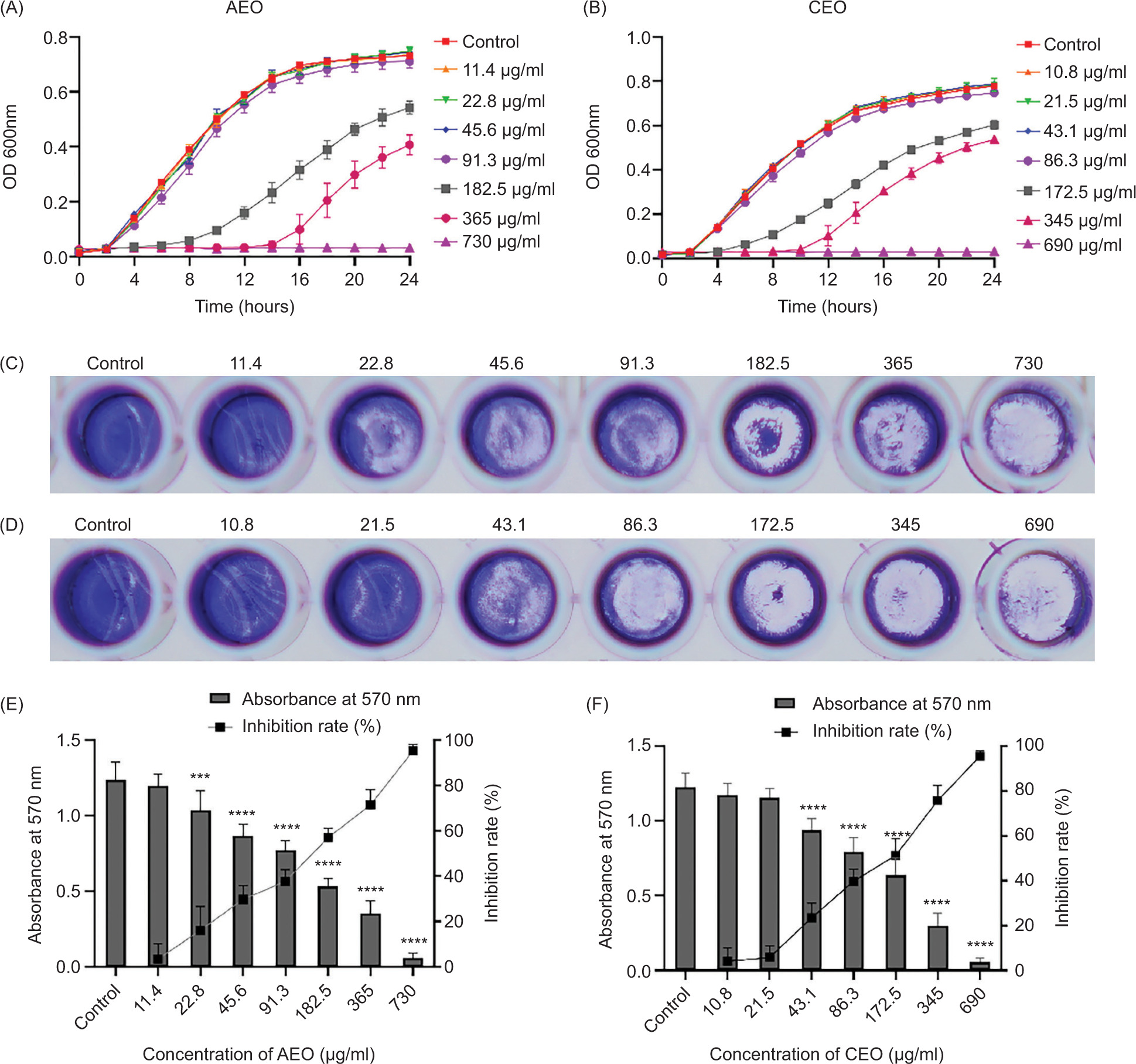 The disruptive effects of AEO and CEO on mature biofilms were evaluated similarly. Exponential-phase S. aureus cells (100 µL) were first cultured in a 96-well microtiter plate containing 100 µL of TSB with 1% glucose and incubated at 37°C for 24 h to allow formation of biofilm. The preformed biofilms were then treated with varying concentrations of AEO (91.3–2,920 μg/mL) or CEO (86.3–2760 μg/mL) at 37°C for 24 h. After treatment, the essential oils were removed, and the biofilms were stained and solubilized as described earlier. Absorbance at 570 nm was measured to assess biofilm disruption. Wells treated with sterile TSB served as blank control. The minimum biofilm eradication concentration (MBEC) was defined as the lowest concentration of essential oils that shows no significant difference in values compared to the TSB blank control. The biofilm elimination rate (%) was calculated as follows: