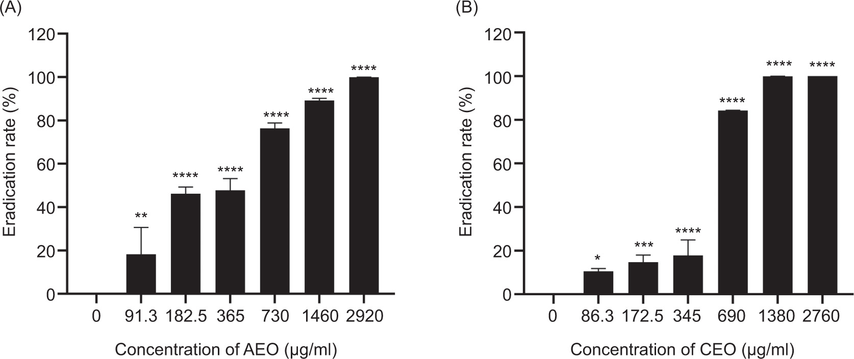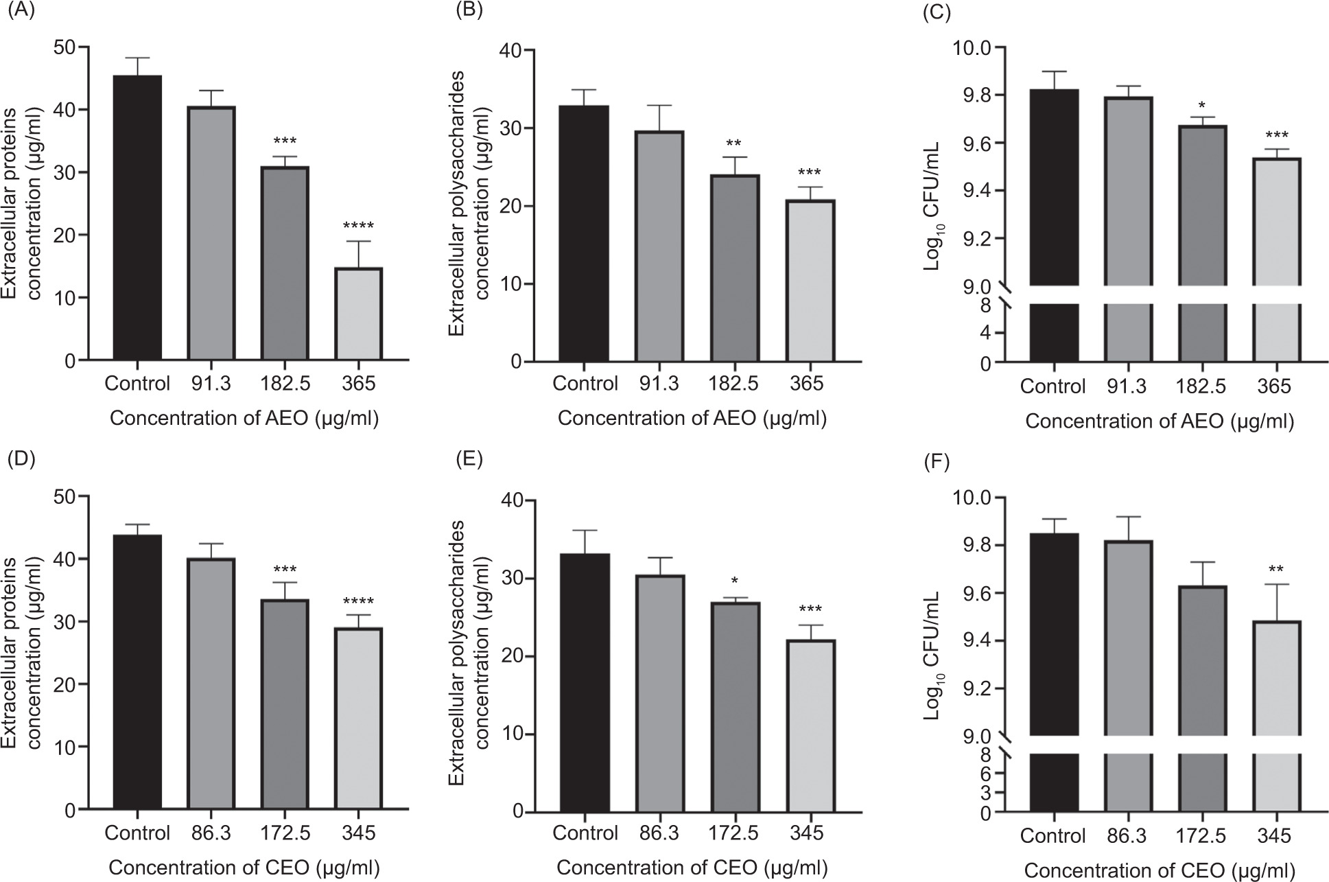 Biofilm viability was assessed by using a method as described previously with minor modifications (Qian et al., 2020). Briefly, after 24-h treatment with AEO or CEO in a 6-well plate, the matured biofilms were disrupted in an ultrasonic water bath. The resulting suspensions were washed thrice with 200 μL of 10-mM PBS and serially diluted in 10-fold increments with PBS. Aliquots of 10 μL from each dilution were plated onto tryptic soy agar (TSA) and incubated at 37°C for 24 h. Bacterial viability was determined by enumerating the colony--forming units (CFUs).