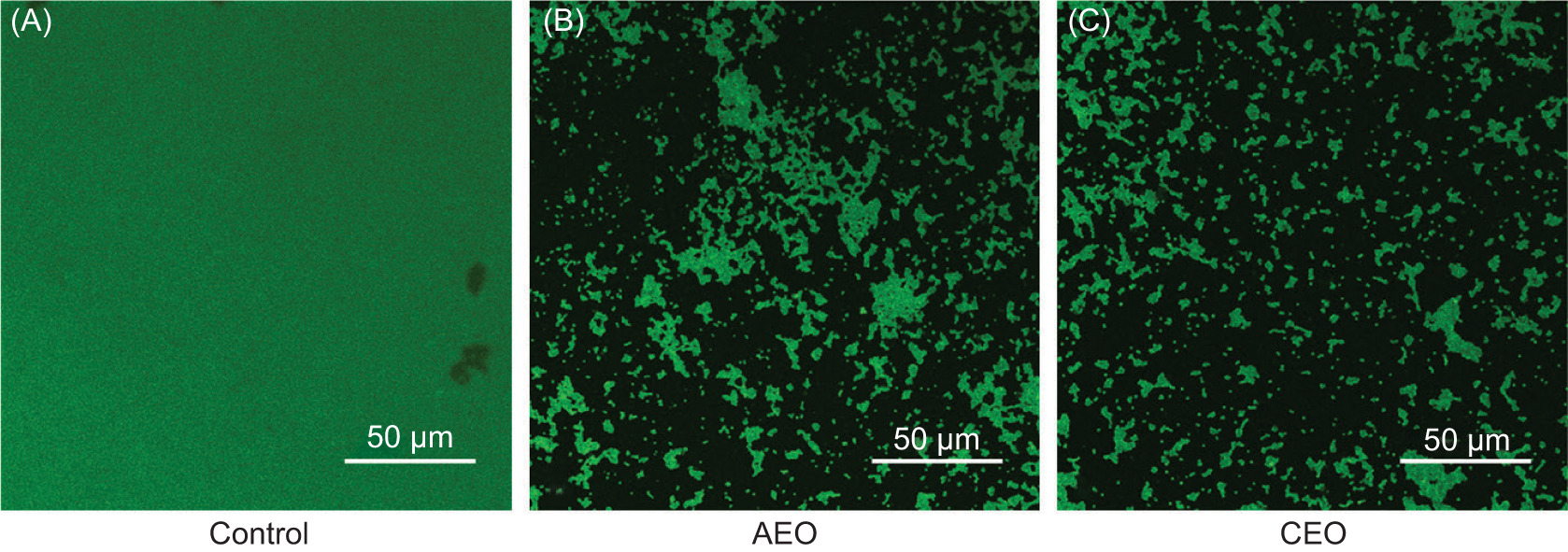 For confocal laser scanning microscopy (CLSM) analysis, S. aureus biofilms were treated with AEO (365 μg/mL) or CEO (345 μg/mL) in 8-well chamber slides (Nunc Lab-Tek; Thermo Fisher Scientific, MA, USA) with 400 µL per well. Following incubation at 37°C for 24 h, the biofilms were gently rinsed thrice with sterile PBS, air-dried at room temperature for 20 min, fixed with 5% formaldehyde for 5 min, rehydrated with 95% ethanol for 5 min, and stained with 0.1% (w/v) acridine orange solution for 15 min in the dark. The control samples were processed identically in the absence of essential oils. The biofilm images were acquired at 488 nm using a CLSM (A1R MP+; Nikon Ltd., Japan).