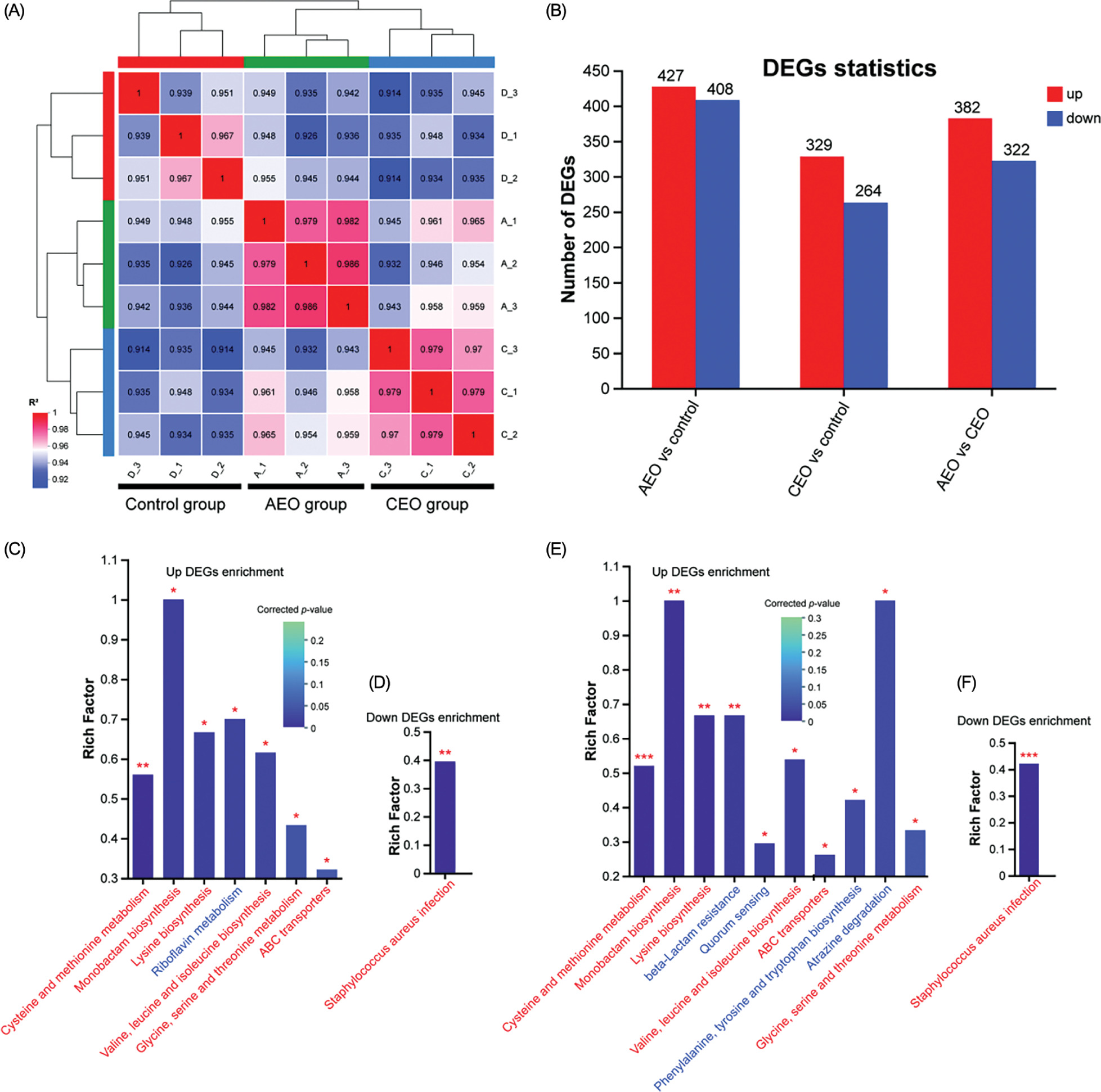 The resulting clean reads were aligned to the S. aureus subsp. aureus reference genome (GenBank accession GCA_000013425.1) using HISAT2 (v2.1.0) (Kim et al., 2019). Differentially expressed genes (DEGs) between the AEO and CEO treatment groups and the control group were identified using the DESeq2 package (v1.38.3) (Quinn et al., 2018) in R software with a fold change of ≥1.5 and a significance threshold (P < 0.05). To investigate biological functions and pathways associated with DEGs, Gene Ontology (GO) and Kyoto Encyclopedia of Genes and Genomes (KEGG) enrichment analyses were performed using the R package clusterProfiler, with a focusing on terms with P < 0.05. The Raw sequence data reported in this paper were deposited in the Genome Sequence Archive in National Genomics Data Center, China National Center for Bioinformation/Beijing Institute of Genomics, Chinese Academy of Sciences (Project Number: PRJCA050085), which are publicly accessible at https://ngdc.cncb.ac.cn/gsa.