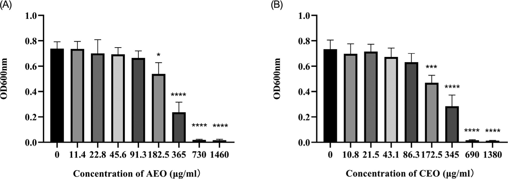 A single colony of S. aureus was inoculated into Mueller–Hinton broth (MHB; Solarbio, Beijing, China) and cultured overnight. The resulting bacterial suspension was adjusted to an optical density at 600 nm (OD600) of 0.6 and diluted 1:100 in fresh MHB. The aliquots were then added to MHB containing either AEO (final concentrations: 11.4, 22.8, 45.6, 91.3, 182.5, 365, and 730 μg/mL) or CEO (final concentrations: 10.8, 21.5, 43.1, 86.3, 172.5, 345, and 690 μg/mL). The control did not contain any essential oil. The bacterial growth was monitored by measuring OD600 at intervals of over 24 h using a microplate reader (BioTek, Winooski, VT, USA). All experiments were conducted in triplicate.