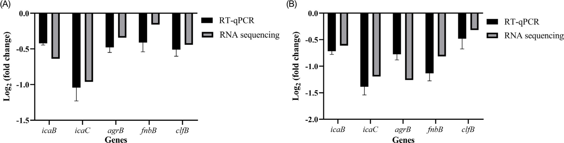To validate RNA-seq results, qRT-PCR was performed. The RNA samples were prepared as described above. Total RNA was reverse-transcribed into complementary DNA (cDNA) by using PrimeScript™ FAST RT Reagent Kit with genomic DNA (gDNA) eraser (Takara, Japan). qRT-PCR reactions were conducted using the TB Green® Premix Ex Taq™ II FAST qPCR kit (Takara) on a CFX Connect real-time PCR system (Bio-Rad Laboratories, Hercules, CA, USA), following the manufacturer’s instructions. Primers were designed using the Primer 5.0 software (PREMIER Biosoft, Canada), which are listed in Supplementary Table S1. The gene expressions were normalized to the triosephosphate isomerase (TPI) of S. aureus, and the relative expression of target genes was calculated by using the two-delta-delta-C-T (2-ΔΔCT) method.