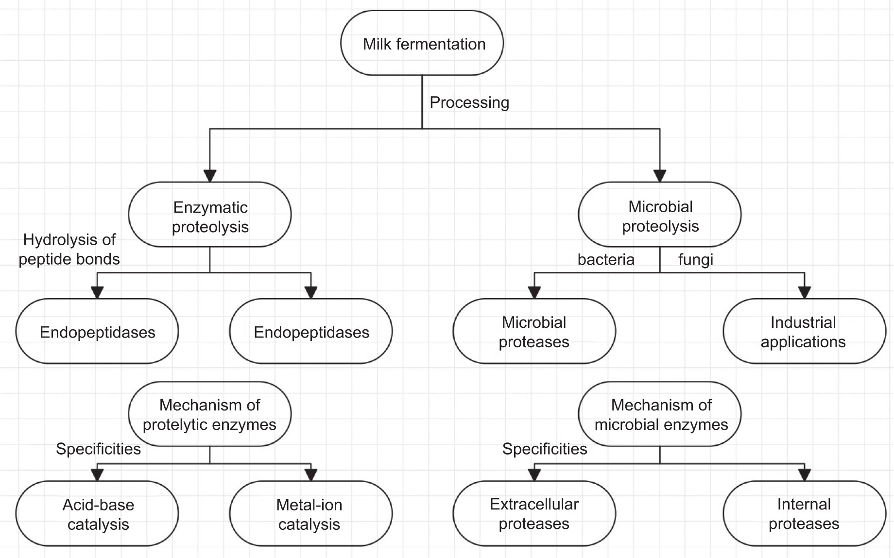 Figure 2. Breakdown of protein proteolysis, applicable to milk fermentation, clearly divided into enzymatic and microbial aspects. Under each, there is the mechanism and their respective specificities.