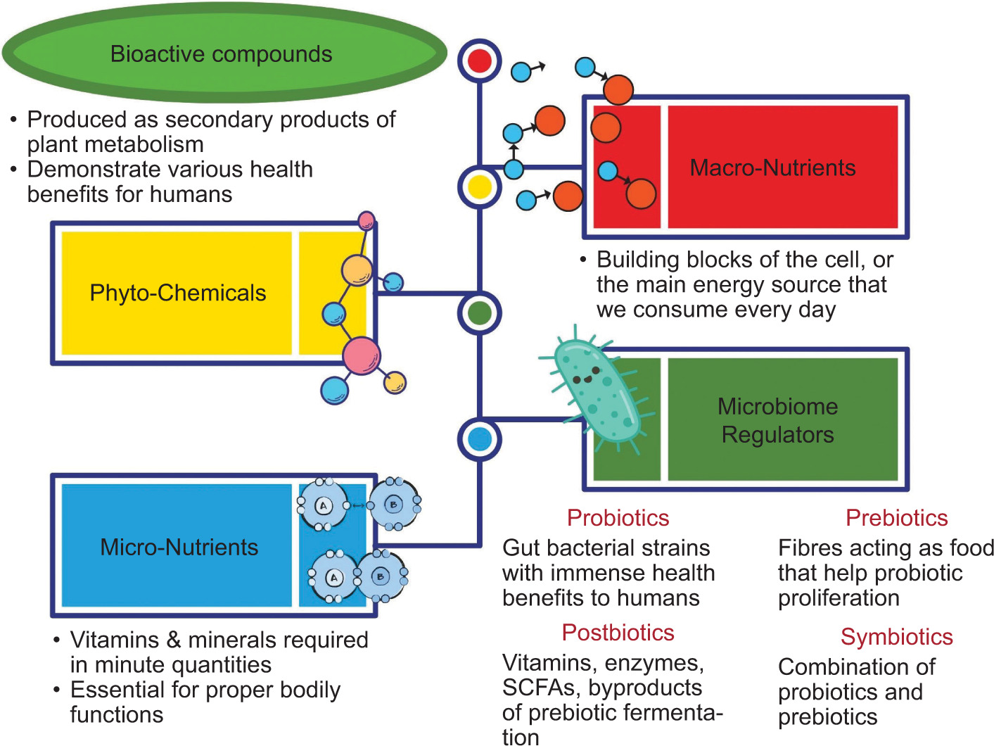 Currently, there is a noticeable increase in diseases linked to poor lifestyle and malnourished foods consumed daily. Bioactive compounds are functional foods that have health benefits. Naturally occurring bioactive compounds are diminished or sometimes absent from currently available food items, possibly contributing to new diseases (Sorrenti et al., 2023). These compounds are primarily found in plant sources (vegetables, whole grains, legumes, nuts, and fruits), animal sources (dairy products, fish), and other sources like microorganisms (probiotics), which are Generally Recognized as Safe (GRAS) by the Food & Drug Administration (FDA) (Banwo et al., 2021; Mondal et al., 2021). Bioactive compounds, also known as nutraceuticals or antioxidants, are categorized into four classes: phytonutrients, macronutrients, gut microbiome regulators and micronutrients. These four main classes (Kussmann et al., 2023) are further divided into subclasses, as illustrated in Figure 1.