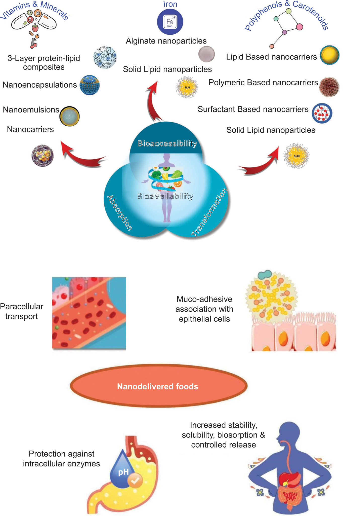 Functional food components, including vitamins, -minerals, antioxidants, and phytochemicals, are essential for optimal human health and well-being. Nutraceuticals are a category of nutritive compounds with pharmaceutical properties that provide -physiological and therapeutic benefits, in addition to nutritive benefits. However, certain challenges must be overcome to maximize the utilization of these compounds in human physiological systems. Some of these include the low stability or rapid degradation of these compounds in the physiological environment of the digestive and gastrointestinal (GI) tracts, poor solubility of the compounds, and decreased biosorption of these compounds in the desired tissues. Nanobiotechnology has helped alleviate these issues by providing tools to enhance the solubility of micronutrients and encapsulate them in nano-carrier/capsule/delivery systems to ensure their stability and targeted release (Mcclements, 2020a). Nanocomposites, nanoemulsions, and nanostructures are extensively used to encapsulate micronutrients and other bioactive compounds, such as vitamins and flavonoids, thereby protecting nutrient delivery. A few noteworthy examples of these systems that have been in commercial use for a few years include nanoceuticals (for applications such as vitamin spray-dispersed nanodroplets), nanosized powders (for applications such as nanochelates of nutrients) and liposomal nanovesicles (for supplying nutrients and enzymes). The type of biopolymers or matrices used for encapsulation of food components plays a vital role in the efficacy of biosorption of these compounds being encapsulated. Variations in the natural food matrices used and the heterogeneous nature of the GI tract, cumulatively influence the bioavailability (BAV), bioaccessibility (BAC) and digestibility of the encapsulated dietary compounds. The interaction between the GI tract and certain types of food matrices leads to delays in both release and plasma clearance of the encapsulated food components (Sun et al., 2020). Hence, the choice of polymer used for the encapsulation of dietary components has a significant bearing on their biosorption.