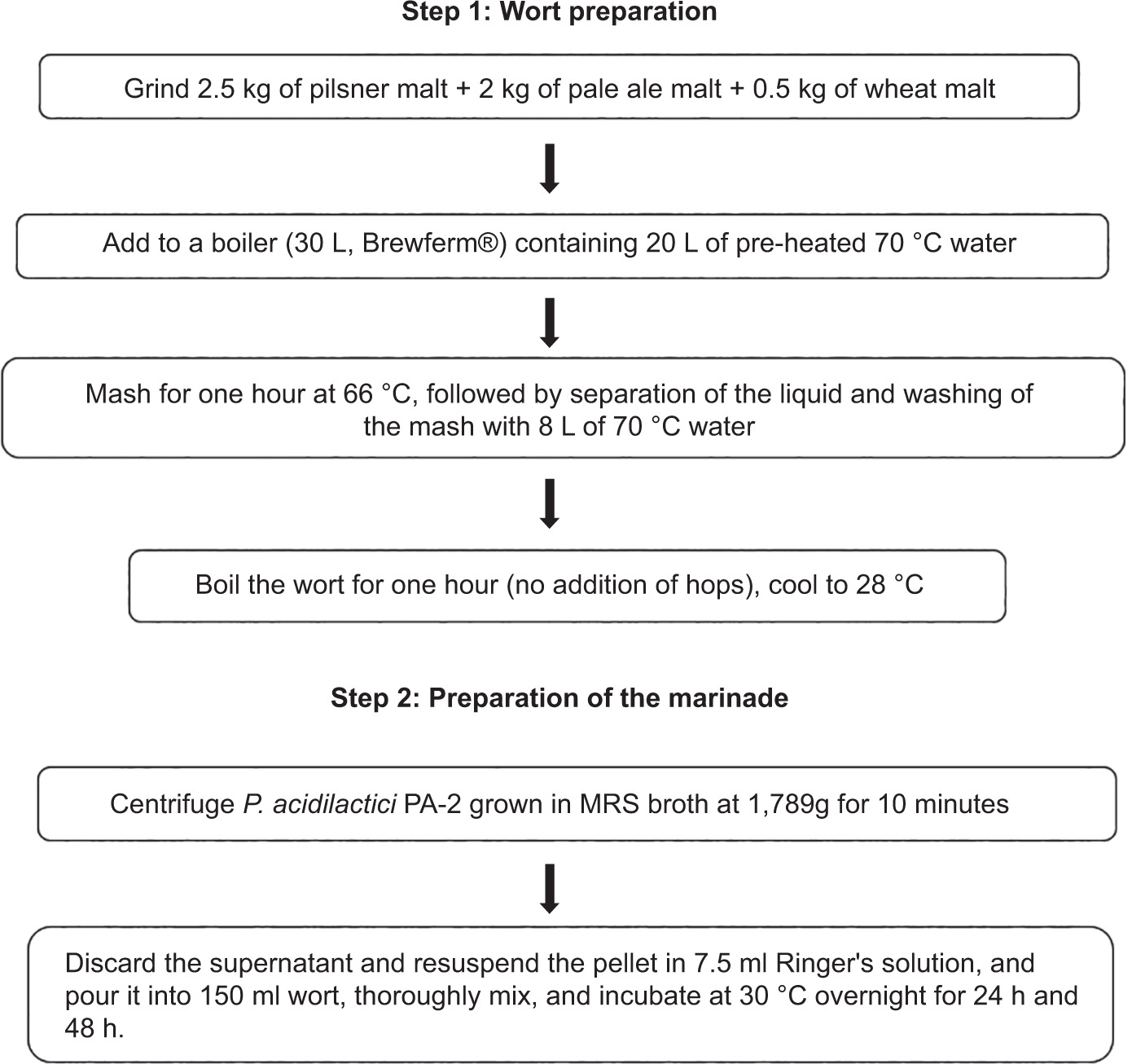 Malt, 2.5 kg of pilsner malt, 2 kg of pale ale malt, and 0.5 kg of wheat malt (Viking malt, Lahden Polttimo Ltd., Lahti, Finland) were ground and added to a boiler (30 L, Brewferm®) containing 20 L of preheated 70ºC water. Mashing was done for 1 h at 66ºC, followed by separation of the liquid and washing of the mash with 8 L of 70ºC water. Thereafter, the wort was boiled for 1 h (no addition of hops), cooled to 28ºC, and used as the growth medium for the chosen bacteria to yield sour wort (Figure 1).