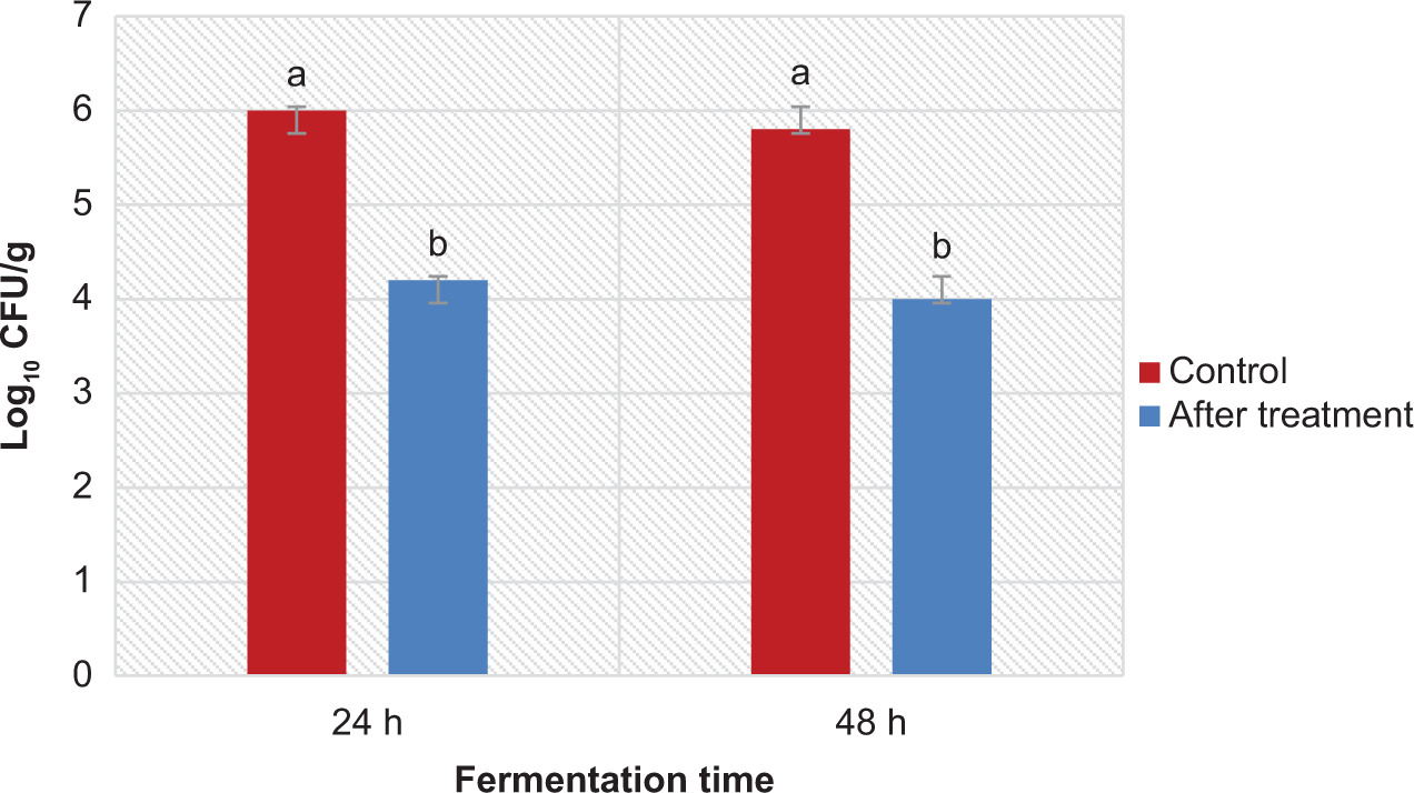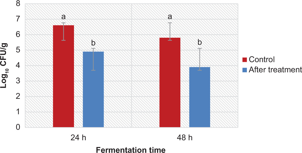 The statistical analysis (ANOVA) indicated no significant difference (p < 0.05) between the reductions achieved by 24-h and 48-h fermentation treatments for both L. monocytogenes and S. typhimurium. This finding suggests that the shorter fermentation duration of 24 h is sufficient to reach effective microbial reduction, with no additional benefit observed by extending fermentation to 48 h. Such results highlight the efficiency of the fermentation process within a relatively short timeframe, which could be advantageous for industrial applications by reducing processing time and cost.