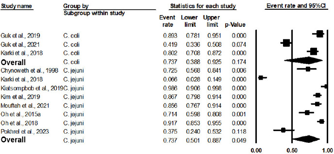 Table 3 Result of the overall meta-analysis and subgroup analysis on the prevalence of aerotolerant Campylobacter spp. based on three potential effect modifiers.