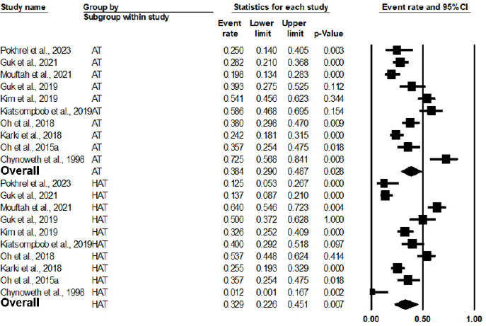 | Variables | Number of studies | Number of isolates | Number of positive isolates (HAT and AT) | Pooled prevalence and 95% confidence interval (CI) | Heterogeneity | |||||