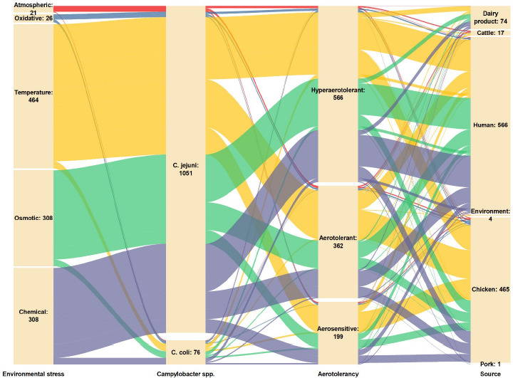 An alluvial plot illustrated the overview of Campylobacter spp. isolates with different levels of aerotolerance from several sources studied against environmental stresses was generated using the Origin 2023b (OriginLab Corporation, MA, USA). Ordinal logistic regression was performed to investigate the relationship between Campylobacter spp. sequence type (ST) and aerotolerance level with the Minitab 19 statistical software (Minitab, LLC, PA, USA). Radial graphs of clonal complexes (CC) and ST of C. jejuni and C. coli with different aerotolerance levels were illustrated with the Flourish platform (flourish.studio/).