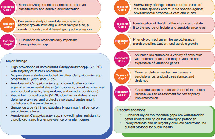 Campylobacter spp. are the bacterial pathogens that cause gastrointestinal illness in humans, and were once asserted to be a microaerophile and unable to survive aerobically. In recent decades, aerotolerant Campylobacter spp. have been reported in the food chain. This review aims to obtain information on the aerotolerant Campylobacter spp., highlighting the prevalence, persistence, genetic relatedness, and risk to humans. After screening, the findings of 39 articles (12 articles for meta-analysis) were synthesized. High pooled prevalence of aerotolerant Campylobacter spp. (75.9%) from meta-analysis indicated the elevated risk of human campylobacteriosis. Campylobacter spp. with a higher aerotolerance level survived better against environmental stresses, including atmospheric, chemical antimicrobial agents, temperature, and osmotic conditions. The situation worsens with reported aerobic growth of Campylobacter spp. The sequence type (ST) of Campylobacter spp. had a statistically significant (P < 0.001) influence on aerotolerance level, suggesting that future studies would be able to postulate the aerotolerance level based on the determined ST. Aerotolerant Campylobacter spp. might pose an increased risk to humans because of their prevalence and persistence in a food chain, possible greater antibiotic resistance, and higher frequency of virulence genes. This underscores the potentially elevated medical burden of this pathogen.