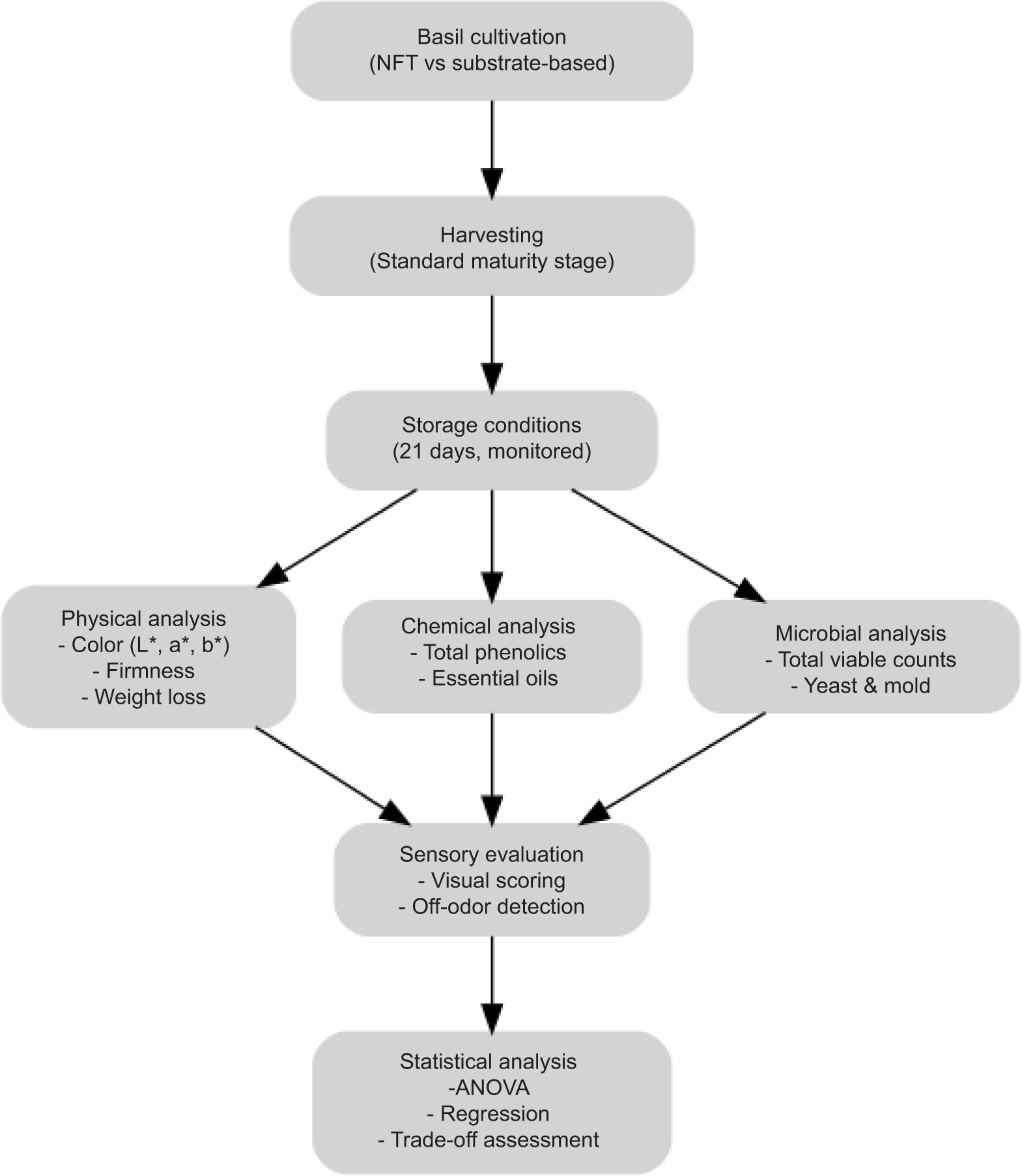 Figure 1. Methodological workflow for the comparative assessment of basil (Ocimum basilicum) cultivated under NFT and -substrate-based hydroponic systems. The diagram summarizes cultivation setup, harvesting, storage, quality analyses -(physical, chemical, microbial), sensory evaluation, and statistical processing.