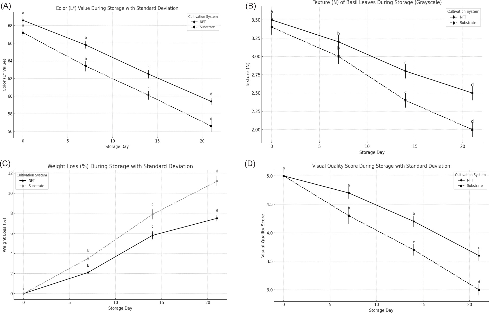 NFT-grown basil exhibited superior physical performance, maintaining color (L*), firmness, and lower weight loss throughout 21 days of cold storage (5 ± 1 °C). Substrate-grown basil, in contrast, accumulated higher essential oil and total phenolic contents, reflected in greater antioxidant activity. Microbial evaluation showed consistently lower total plate counts (TPC) and yeast/mold loads in NFT samples, remaining below the accepted safety threshold of 106 CFU g–1 at Day 21. Two-way ANOVA confirmed significant effects of cultivation system and storage duration for most quality parameters (p < 0.05). Pearson correlation analysis further demonstrated strong positive associations between chlorophyll content and firmness (r = 0.82, p < 0.01) and between total phenolics and antioxidant activity (r = 0.88, p < 0.001), while principal component analysis (PCA) clearly separated the two systems based on their quality and microbial profiles.