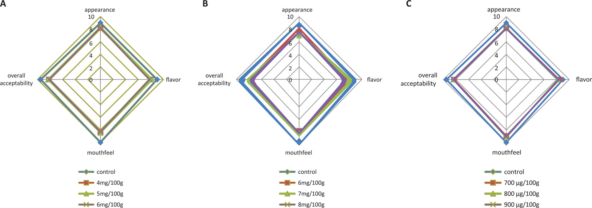 RA-fortified pasta samples (Figure 1C) again exhibited no significant differences between the fortified and controlled samples with regard to their appearance, mouthfeel and the overall acceptability, with average scores ranging from 8.31 to 8.40.