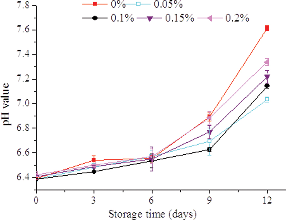 The change of pH during the storage of fish is closely related to microbial metabolism, enzyme activity and accumulation of acidic substances, which is considered as an important indicator for evaluating the spoilage and deterioration of fish. The pH value of all treatments gradually increased during the storage (Figure 1). Volatile bases produced by endogenous or microbial enzymes can probably increase the pH value (Riebroy et al., 2007). Similar patterns in pH change have also been reported for sardine, sea bream and blue fish (Erkan et al., 2011; Goulas and Kontominas, 2007; Özyurt et al., 2012). However, another study has reported that pH at first decreased, and then increased during chilled storage of sturgeon treated with radish seed protein extract (Li et al., 2018b). This was assumed to be affected by the seasons, diet, species, level of activity and post-mortem evolution of the flesh (Nie et al., 2018). In this study, the initial pH of fish samples was about 6.40. This observation is in agreement with that of Nie et al., who reported a pH value of 6.48 for fresh Japanese sea bass before treatment (Nie et al., 2018). No significant differences were observed between the control and 0.05%, 0.10%, 0.15%, 0.20% AOB groups during the first 6 days. The pH values of 0.05%, 0.10% and 0.15% groups were significantly lower at 9 and 12 days than in the control samples. During the entire time of storage, the 0.05% and 0.10% samples exhibited the lowest pH levels.