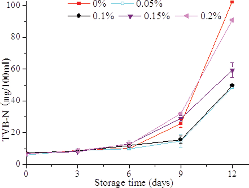 Figure 2. Changes in TVB-N contents of sturgeon fillets during storage at 4 °C.