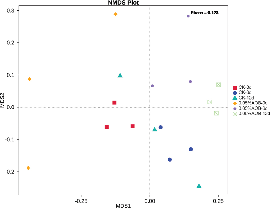 Non-metric multi-dimensional scaling (NMDS) based on the Bray–Curtis distance of species abundance was used to study the structure of microbiota between the control and the 0.05% AOB treatment (Figure 3). The microbial composition of the control group was similar in the middle and late storage period (CK-6 d, CK-12 d), but different from that of the 0.05% AOB treatment group (0.05% AOB-6 d, 0.05% AOB-12 d), which could have been caused by the antimicrobial properties of AOB.
