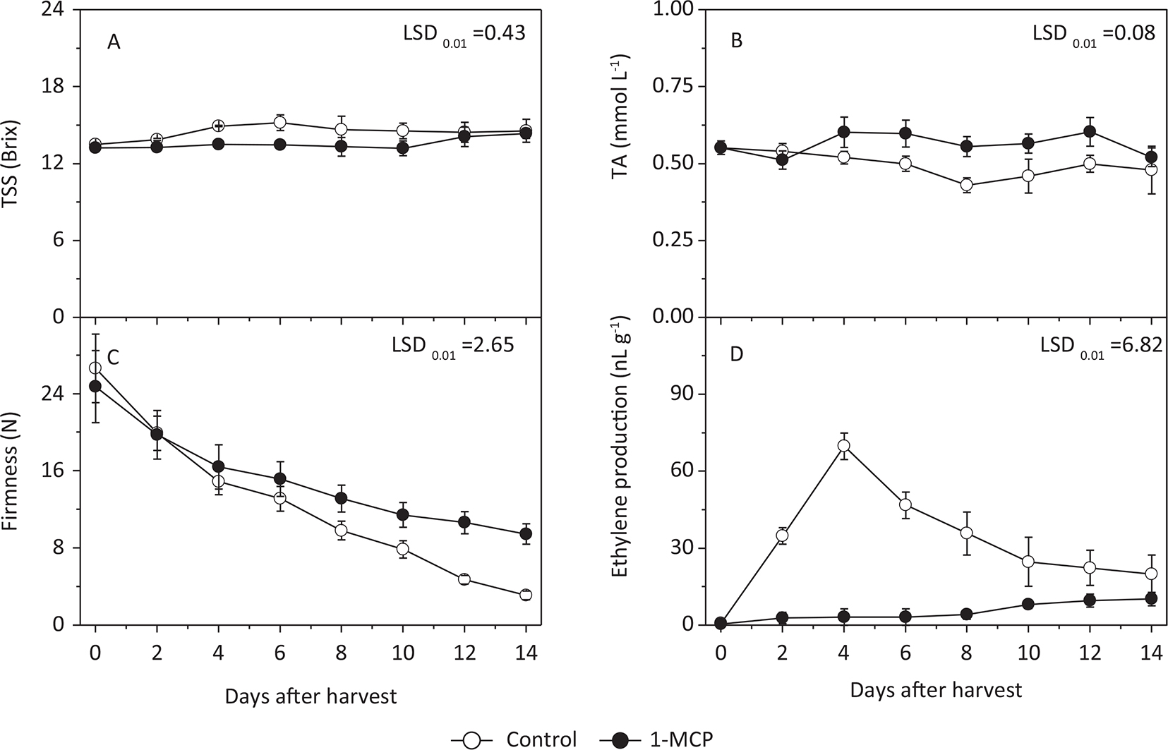 Figure 1. Effects of different treatments on (A) total soluble solids (TSS), (B) total acid (TA), (C) firmness and (D) ethylene production in ‘Hujingmilu’ peach fruit during ripening at shelf-life temperature. LSD, least significant difference.