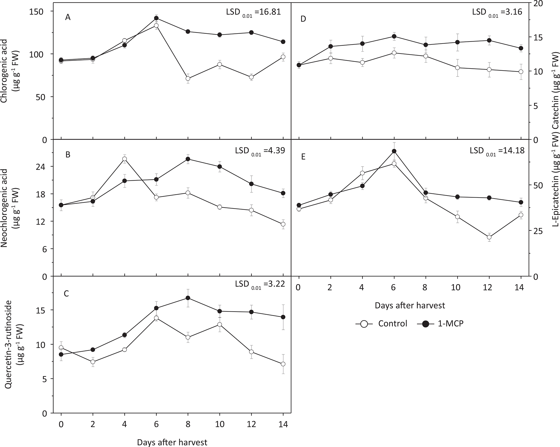 Figure 4. Effects of different treatments on polyphenols including (A) chlorogenic acid, (B) neochlorogenic acid, (C) quercetin-3-rutinoside, (D) catechin and (E) L-epicatechin contents of ‘Hujingmilu’ peach pulp after harvest at shelf-life temperature.