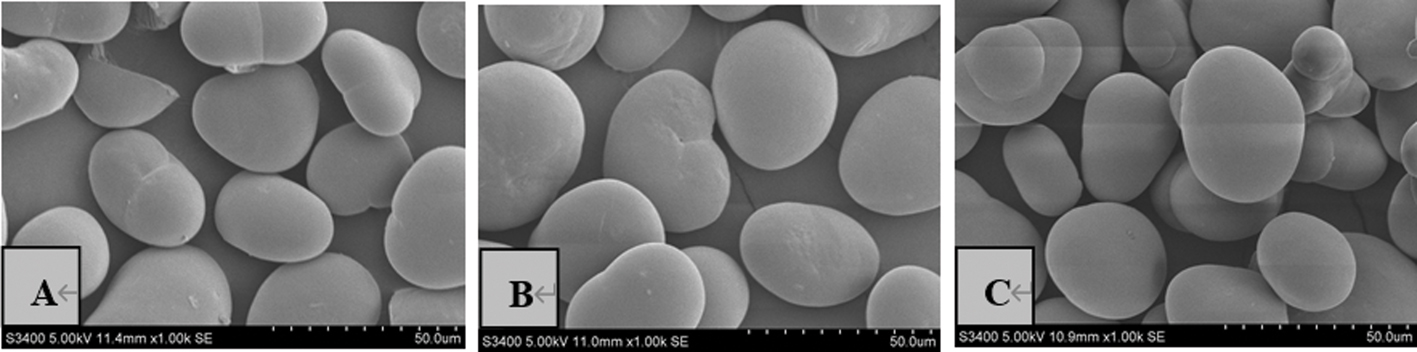 The morphology of starch granules was examined by scanning electron microscopy (SEM, S-3400N, Hitachi, Tokyo, Japan) with 20 kV potential accelerator. For SEM, the starch sample was directly applied onto double-sided sticky tape placed on metal stubs and coated with carbon, observed and photographed (Wang et al., 2010).
