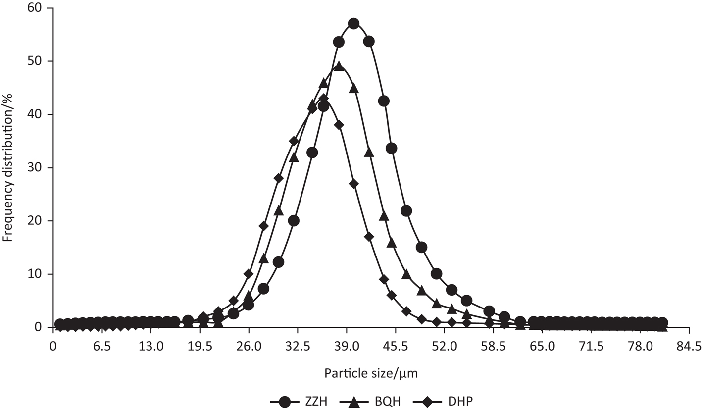 The particle size distribution is the ratio of the number of particles with different size ranges to the total number of particles. This index affects the use of starch and product quality. The particle size and distribution of different red adzuki bean starch particles are shown in Table 2 and Figure 3. The average particle diameter and surface area of the three types of starch particles of red adzuki bean showed significant differences. The particle size of ZZH was 43.29 μm, which is significantly higher than the values determined for the other two types. The average particle size of DHP was 35.58 μm, which is significantly lower than those of the other two types. BQH showed a surface area of 15.52 μm, which is significantly larger than those of the other two types. ZZH was found to have a surface area of 8.3 μm, which was significantly lower than those of the other two types. When the starch particle size is large, the amylopectin content is low. Interactions among thermal energy, water absorption and swelling cause the α-1,6 glycosidic bond structure in the amorphous region of the starch to loosen, and small-molecule starch cross links with other chains to form a larger particle structure (Wang et al., 2015). This causes the starch to show a lower gelatinisation temperature during the heating process and decreases the taste quality; therefore, DHP, which showed a higher amylopectin content and relatively small particle size, would have a soft mouthfeel after processing. These results indicate that DHP is suitable for producing instant red adzuki bean paste and other products. Reddy et al. (2017) found that starches from adzuki bean showed a unimodal size distribution, with an average diameter value of 45.65 μm, ranging between 25 and 60 μm.