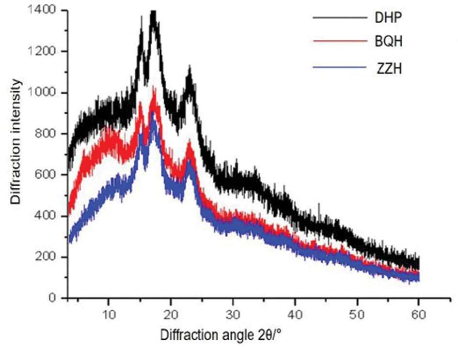 The crystal structure and relative crystallinity of the three types of adzuki bean starch are shown in Figure 4 and Table 3. The three types of adzuki bean starch showed strong diffraction peaks at diffraction angles (2θ) of 15°, 17° and 23°, indicating typical A-type crystal structures. The relative crystallinity ranged from 22.7 to 29.4% (P < 0.05), with DHP showing the highest value. As the crystallinity of starch is mainly related to accumulation of the amylopectin double helix, DHP starch also had the highest amylopectin content. Exposure to heat and water weakens the ability of amylopectin to form hydrogen bonds with water molecules compared to this ability of amylose; the binding force with water is also lower than that of amylose. Similar XRD patterns were reported for the red adzuki bean starch by Reddy et al. (2017). However, Wang et al. (2017), Gong et al. (2017) and Xu et al. (2018) found that the native red adzuki bean starch exhibited a C-type crystalline structure, that is, a mixture of A- and B-type crystalline structures.
