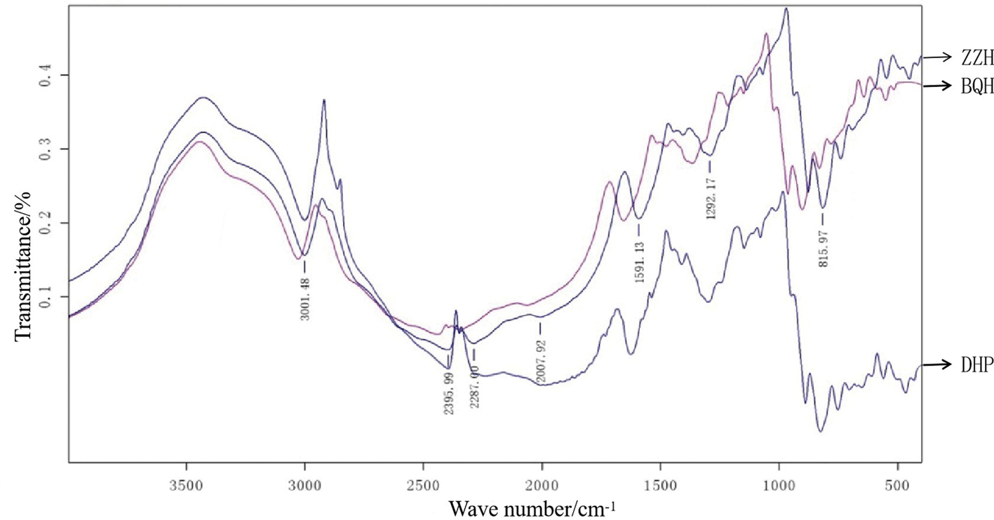 The results of FT-IR spectroscopy of the three types of red adzuki bean starch are shown in Figure 5. The wide frequency band near 2,934–3,001 cm-1 indicates complex vibrational stretching of the intermolecular and intramolecular hydroxyl groups; the peak at 2,007–2,395 cm-1 corresponds to the ring -CH extension related to the methine hydrogen atom; the peak at 1,292–1,591 cm-1 corresponds to coupling of CO stretching and COH bending in the starch molecule; the peaks observed at 766–996 cm-1 are caused by the skeleton mode vibration of α-1,4 glycosidic bonds. The absorption peak intensities of the three types of red adzuki starch showed some differences. The order of intensity was: ZZH > BQH > DHP. The absorption peak intensity is positively correlated with the amylose content. Therefore, the absorption peak intensity of ZZH was strong because of its high amylose content (Correia et al., 2012). These results agree with FT-IR spectra of red adzuki bean reported in previous investigations (Gong et al., 2017; Reddy et al., 2017; Xu et al., 2018).