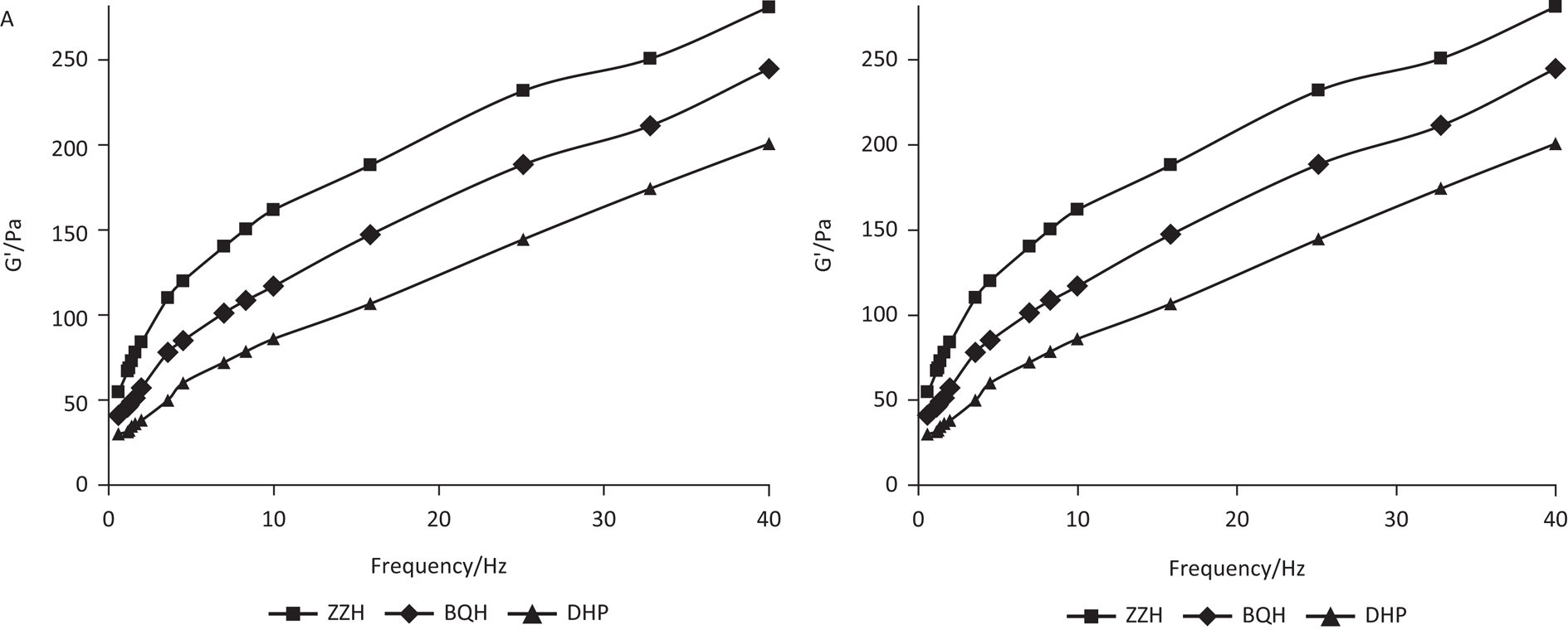 Figure 7. The storage modulus (A) and loss modulus (B) are functions of dynamic frequency.